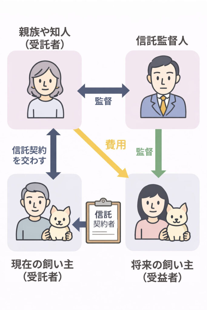 ペットの飼育費用となる財産を信託し、ペットを世話する人に費用を渡す仕組みです。